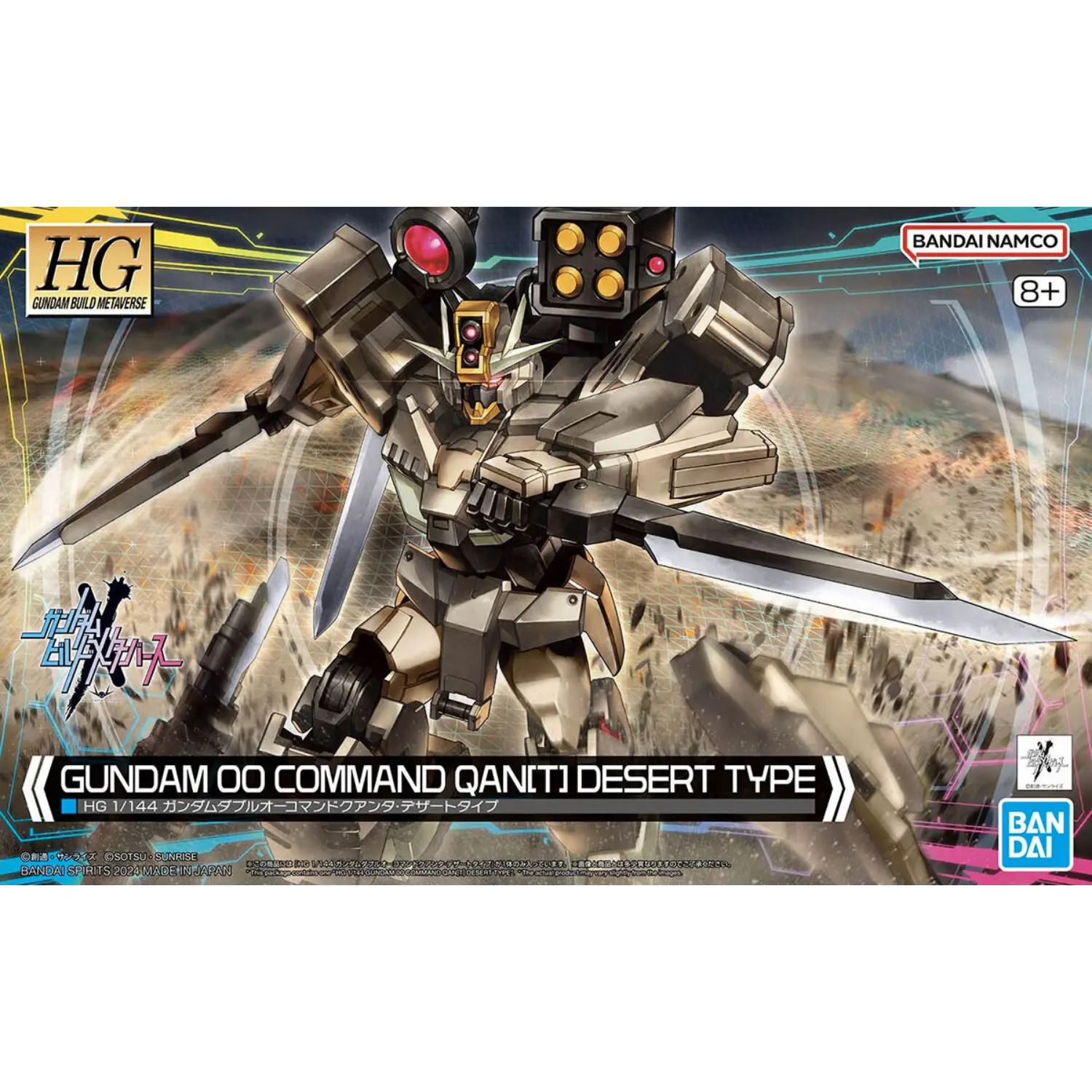 The 1/144 Gundam 00 Command Qan[T] (Desert Type) from Gundam Build Metaverse is a customized mobile suit combining elements of the SD Command Gundam and Double O Qan[T]. Equipped with an arsenal of ranged and melee weapons, this High Grade (HGGBM) model kit includes a command sword, heavy machine gun, missile launcher, and combat knives for versatile displays.