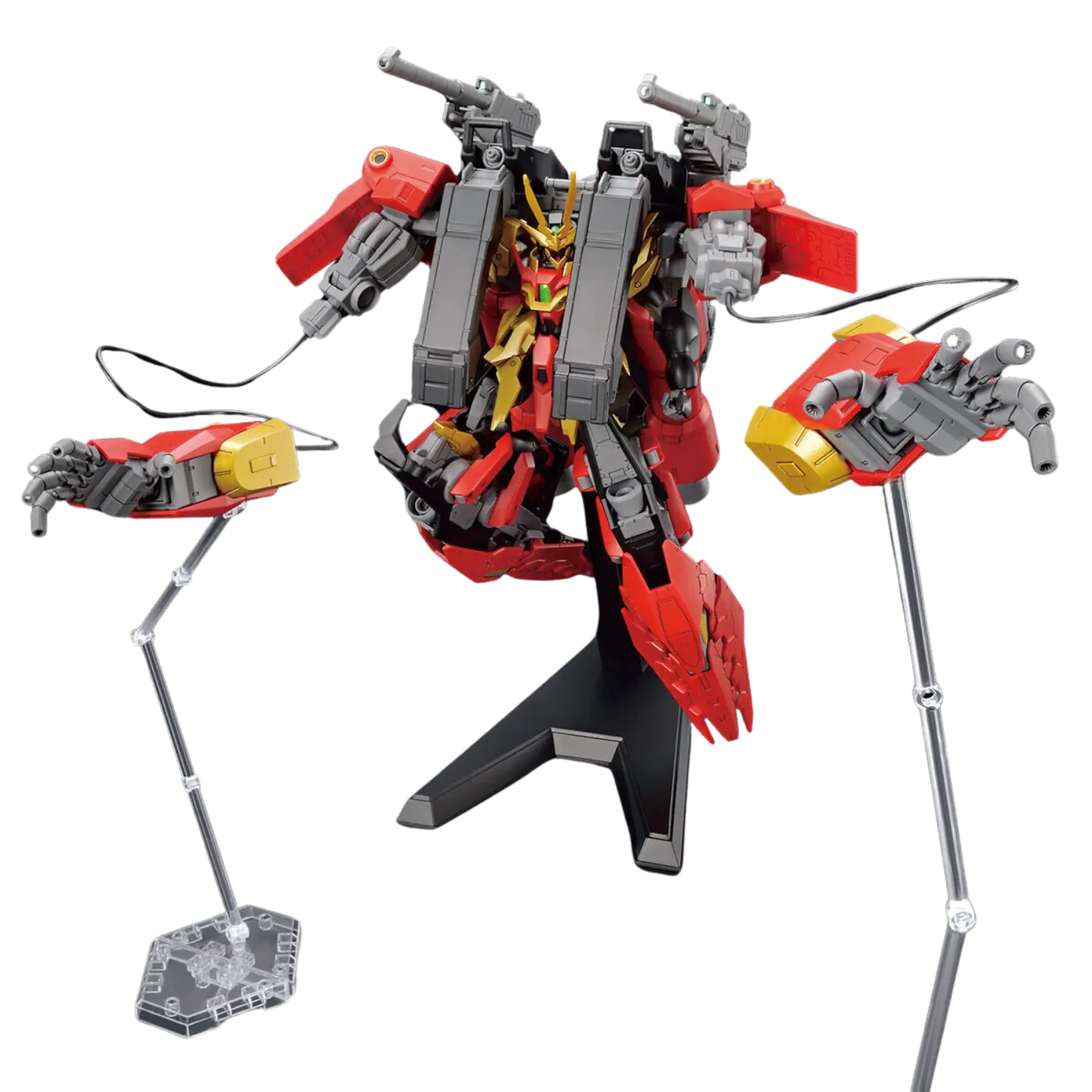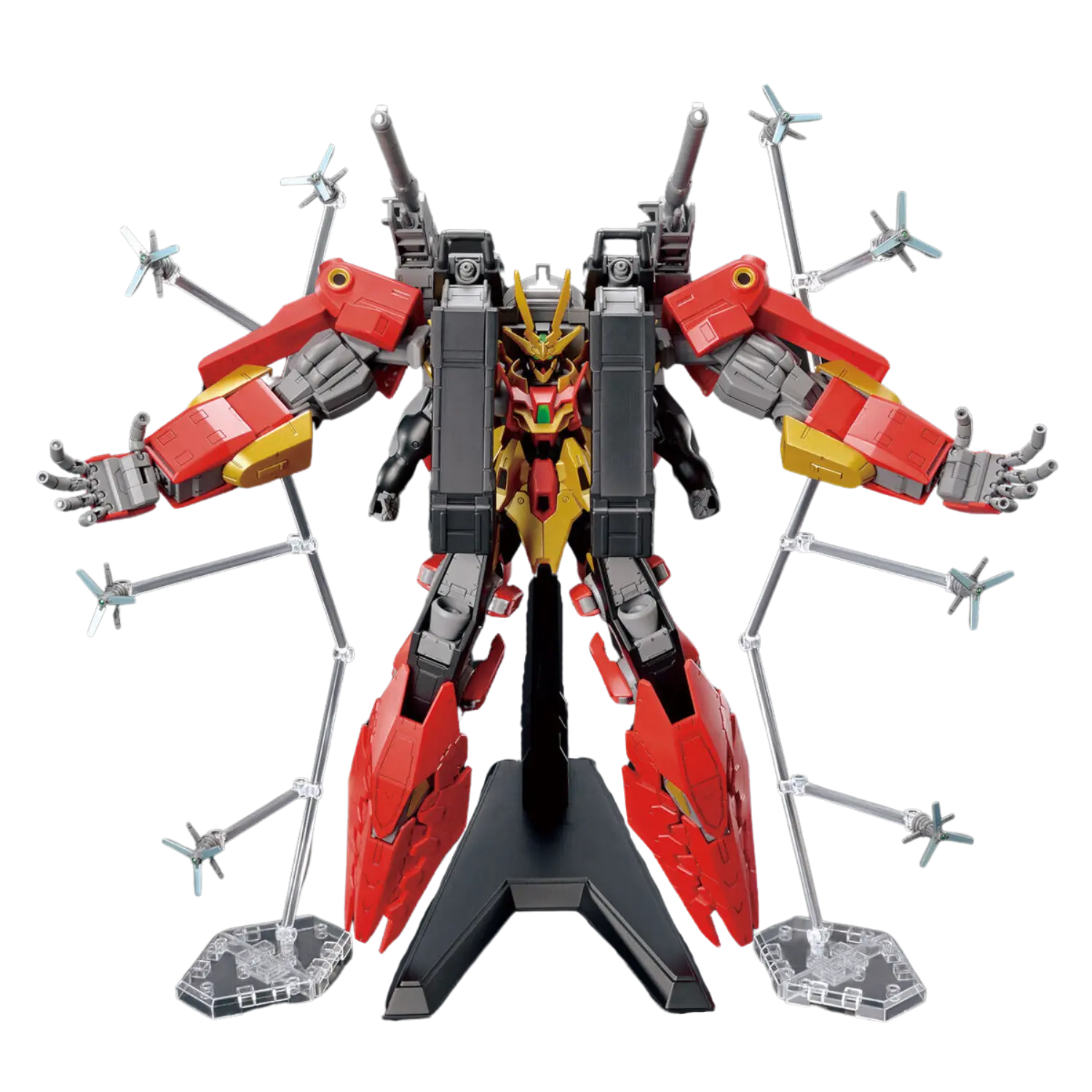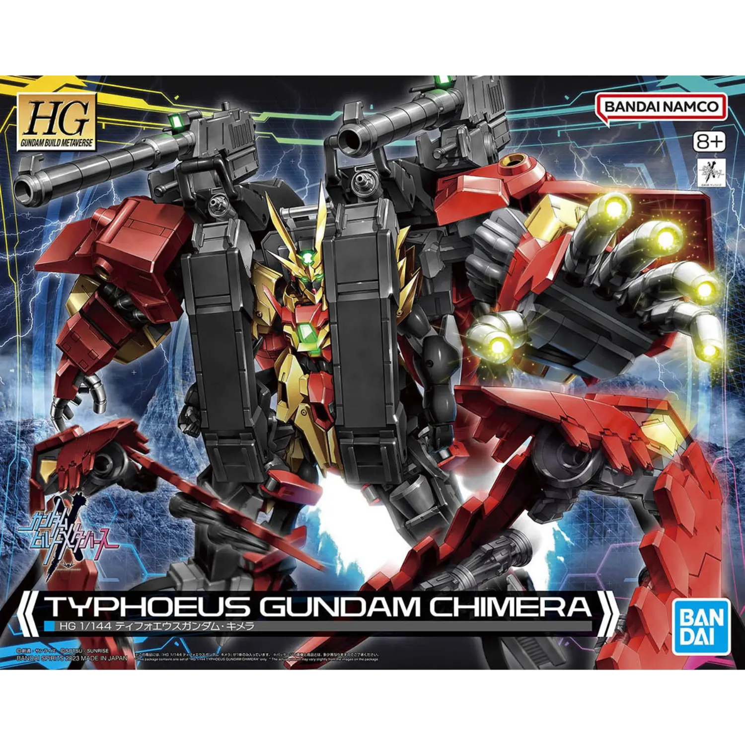 The 1/144 Typhoeus Gundam Chimera from Gundam Build Metaverse is a large-scale mobile suit with removable armor to recreate the Typhoeus Gundam and can transform into Mobile Armor mode. This High Grade (HGGBM) kit includes reflector bits with a dedicated display stand, joint parts, and lead wires for dynamic display options.