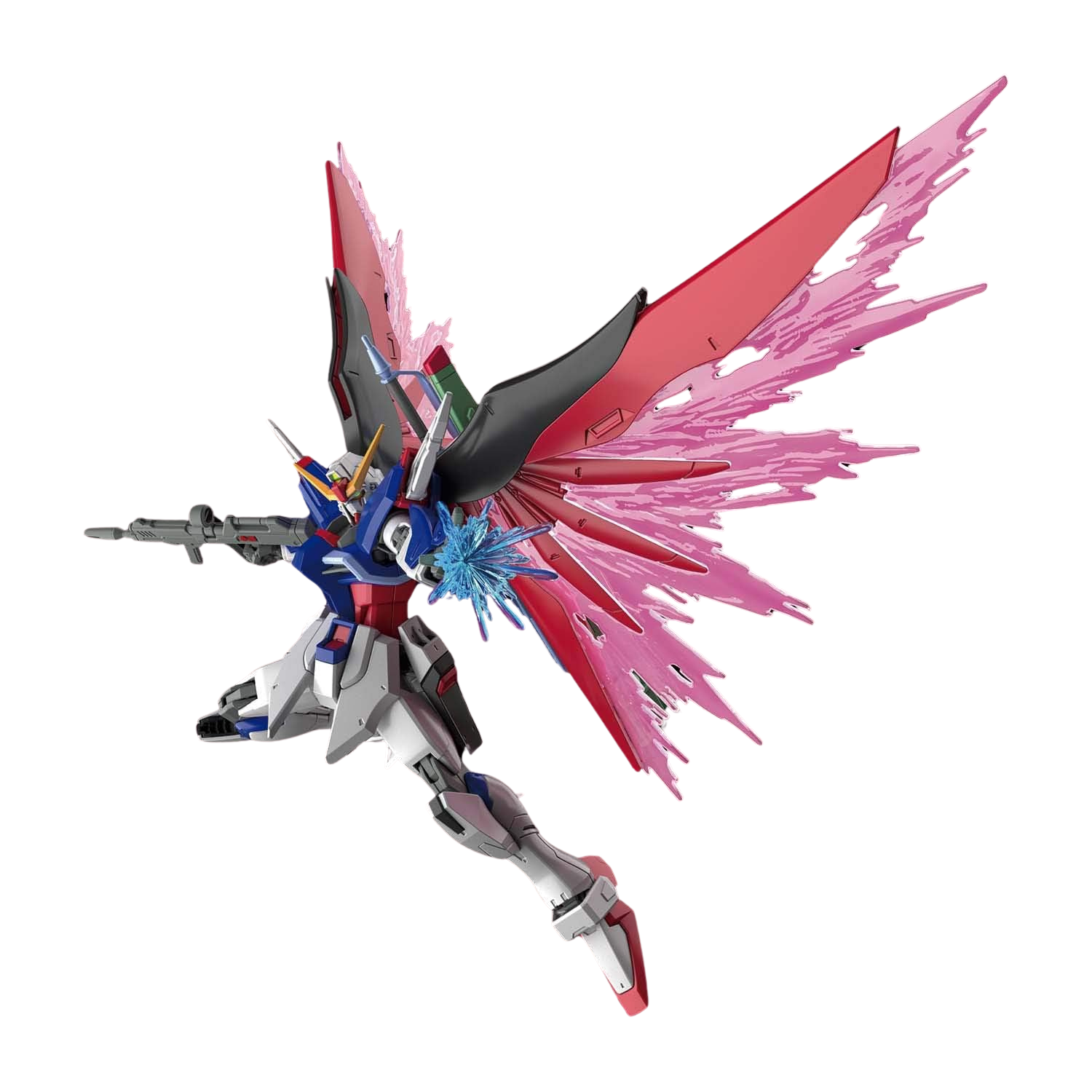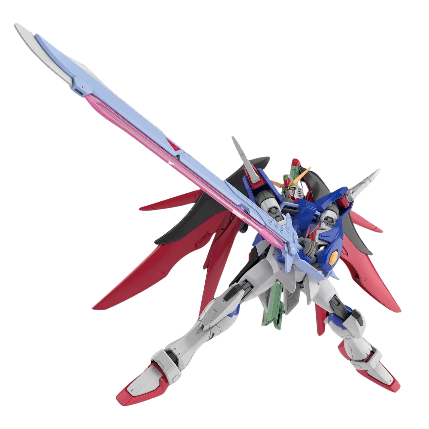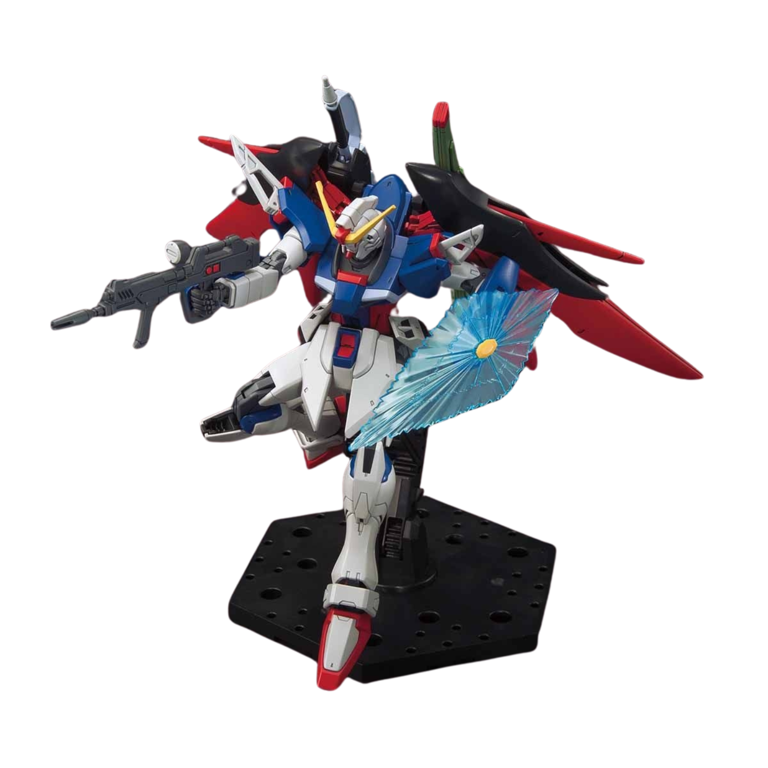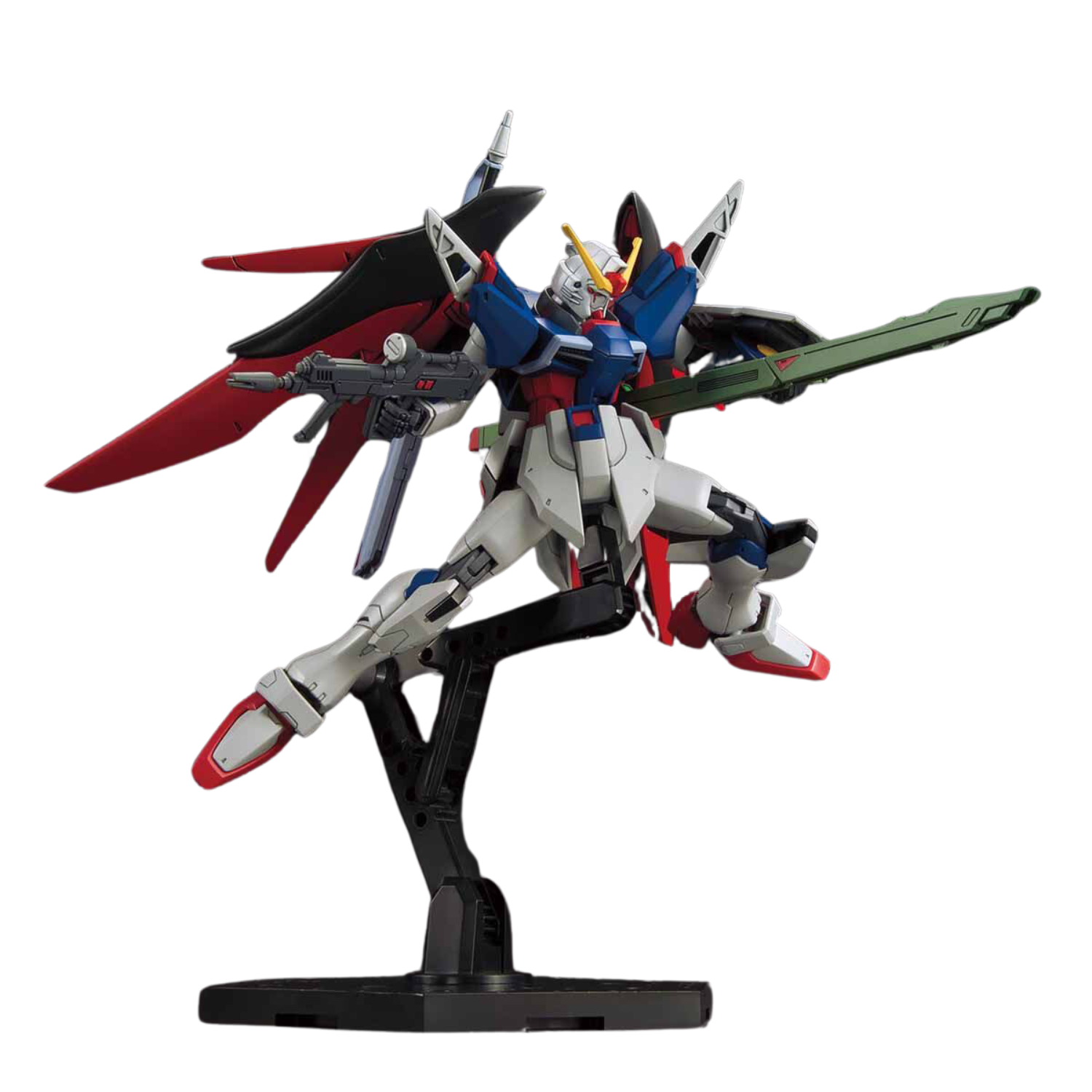 The HGCE 1/144 #224 Destiny Gundam, piloted by Shinn Asuka in Mobile Suit Gundam SEED Destiny, is a completely new mold featuring enhanced articulation and a striking array of weapons and effect parts. This updated kit includes clear-cast Wings of Light and various beam effect parts, allowing for dynamic and iconic poses. Molded in color for a stunning finish without the need for painting, this snap-fit kit also includes foil stickers for added detail.