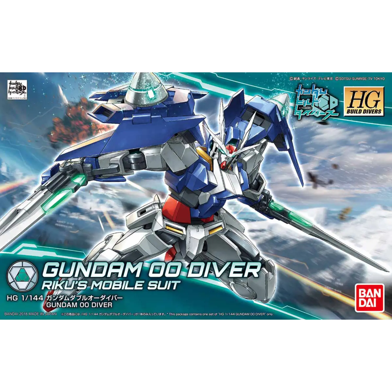 The 1/144 Gundam 00 Diver from Gundam Build Divers features the customizable 00 Gundam as used by the series' hero. This High Grade (HGBD) model kit includes 3 pairs of interchangeable hands and multiple 3mm joints, allowing for compatibility with weapons from other HG series for diverse display options.