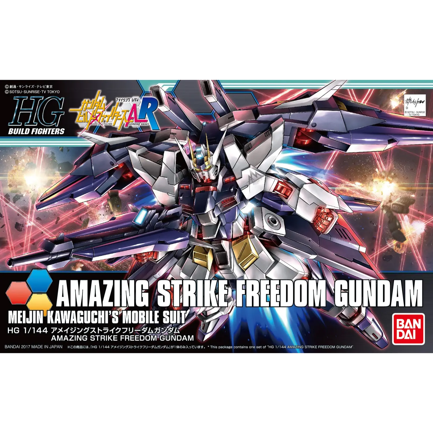 The 1/144 Amazing Strike Freedom Gundam from Gundam Build Fighters Amazing Ready is Yuuki Tatsuya's formidable mobile suit, featuring posable winglike armor with beam cannons, rail guns, and Dragoon Shields. This High Grade (HGBF) kit also includes a large beam rifle for dynamic battle displays.