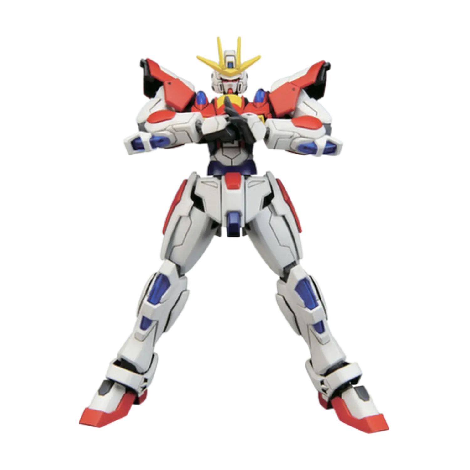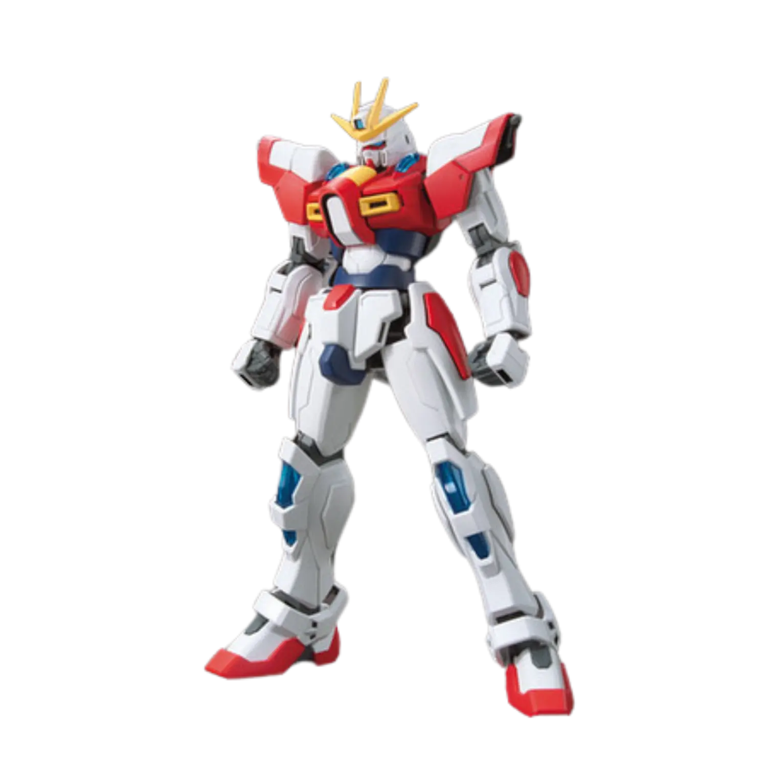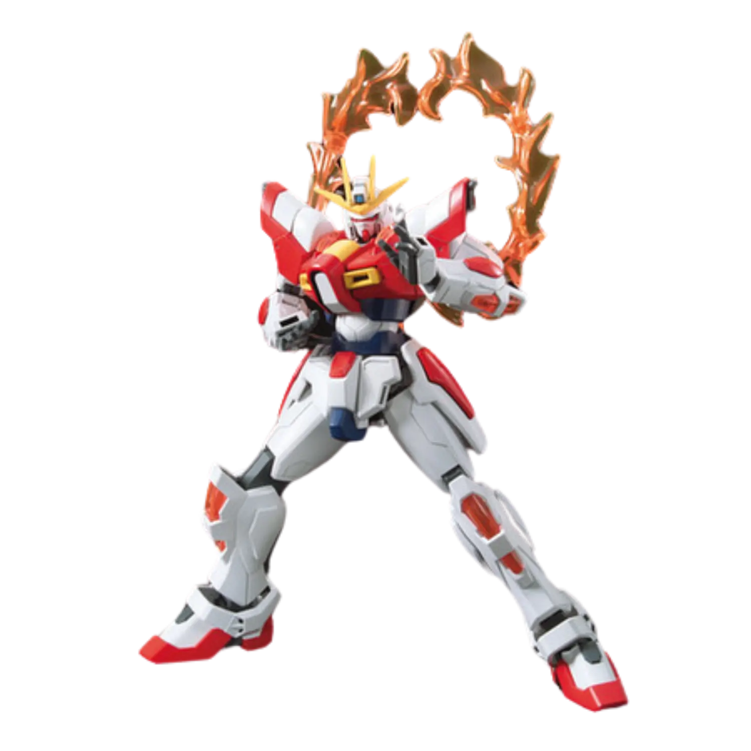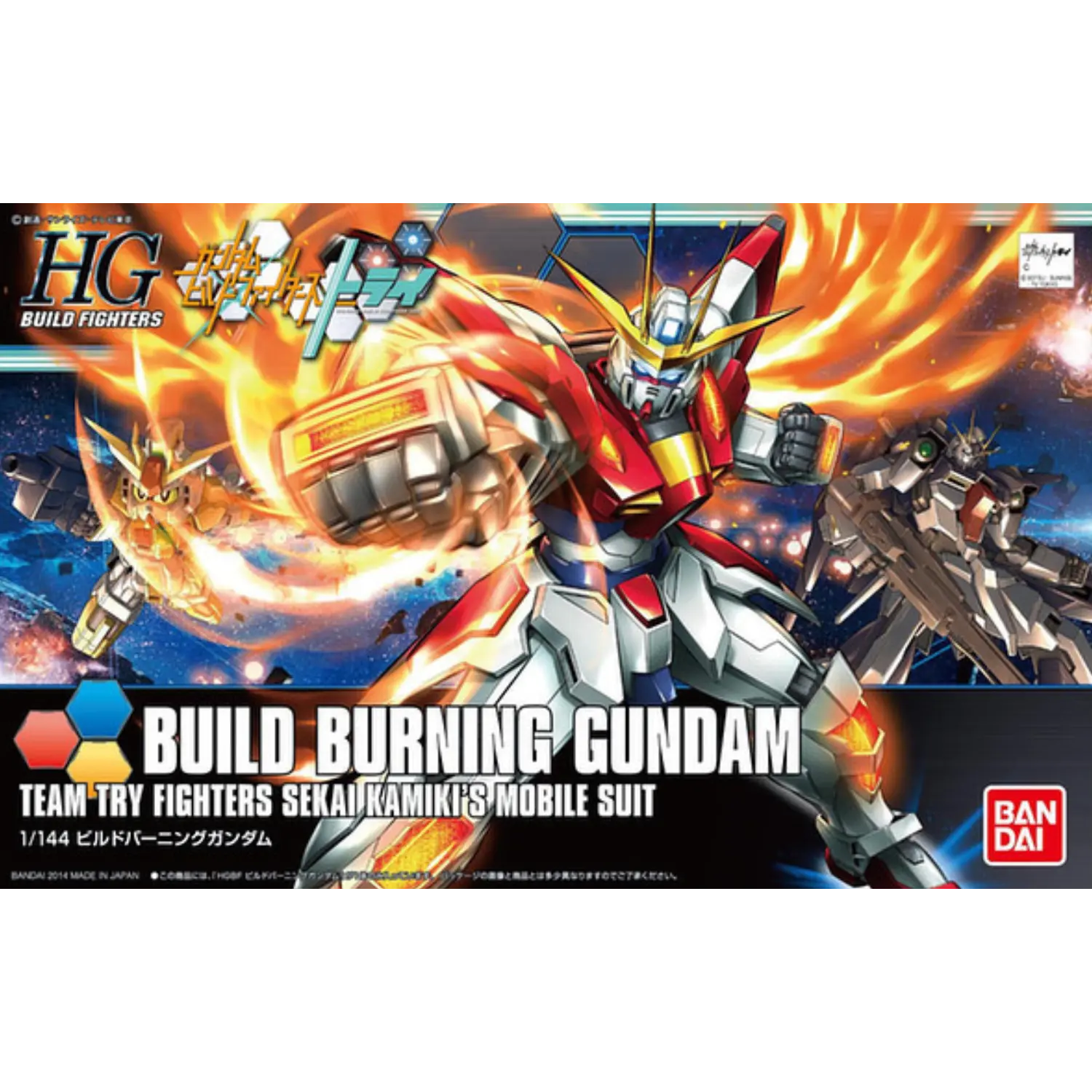 The 1/144 Build Burning Gundam from Gundam Build Fighters Try offers dynamic display options with interchangeable translucent plastic parts for normal or fight mode styles. This High Grade (HGBF) model kit includes fiery punch and kick effects, as well as hand parts for various martial arts poses.