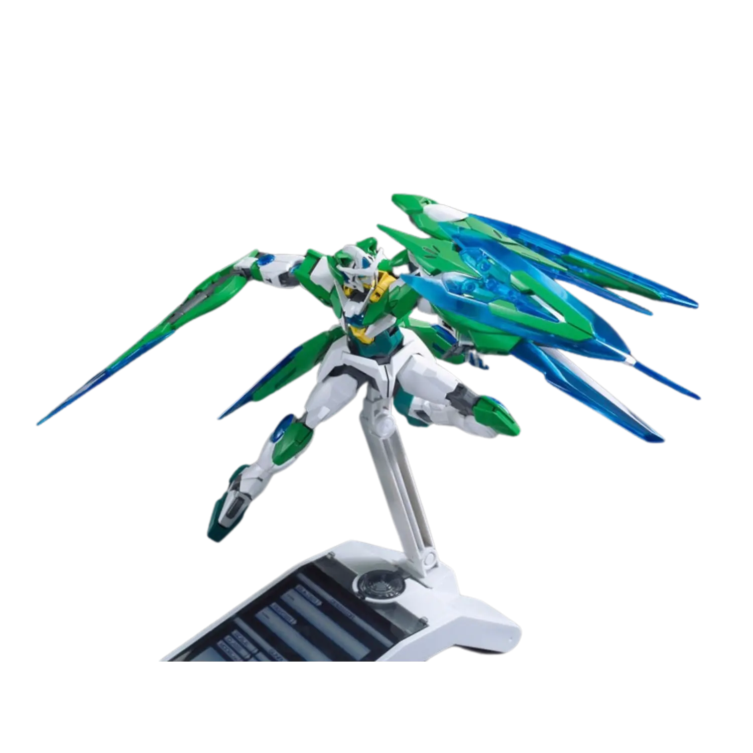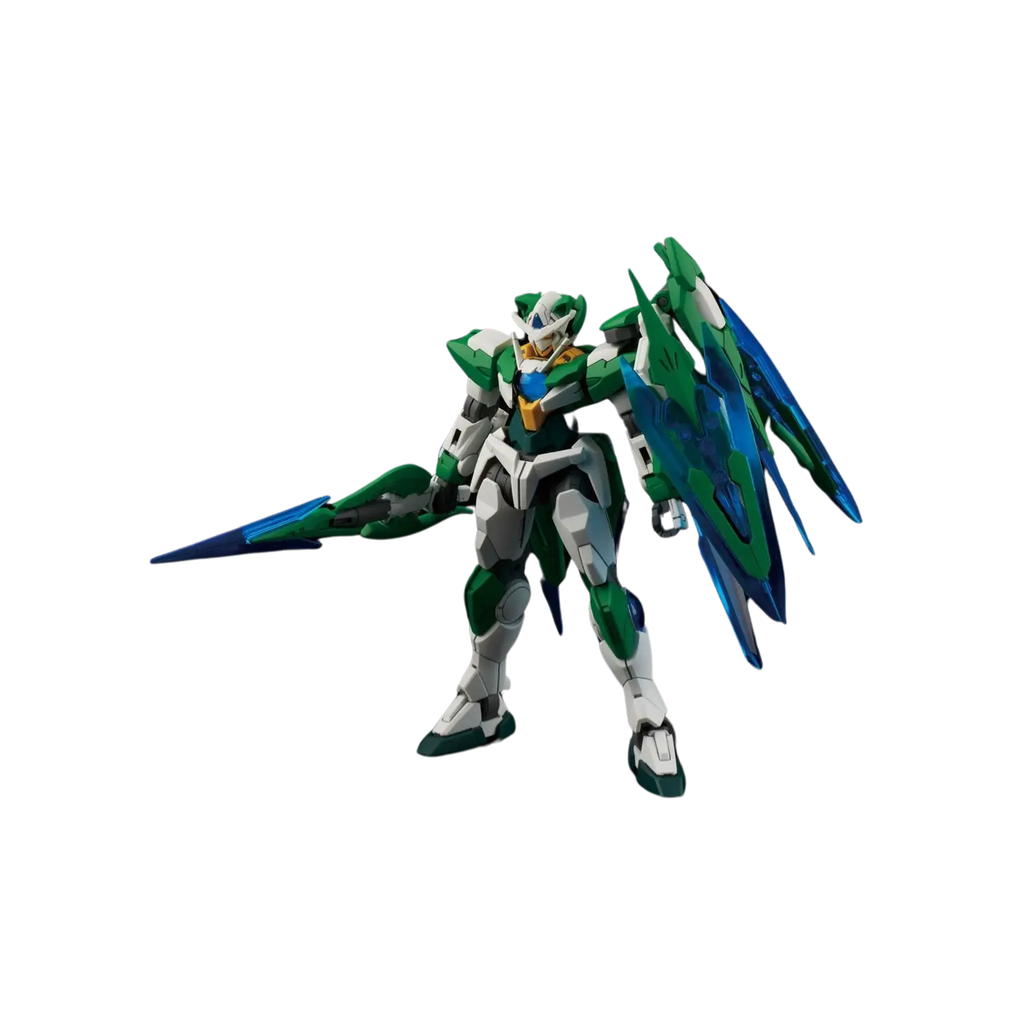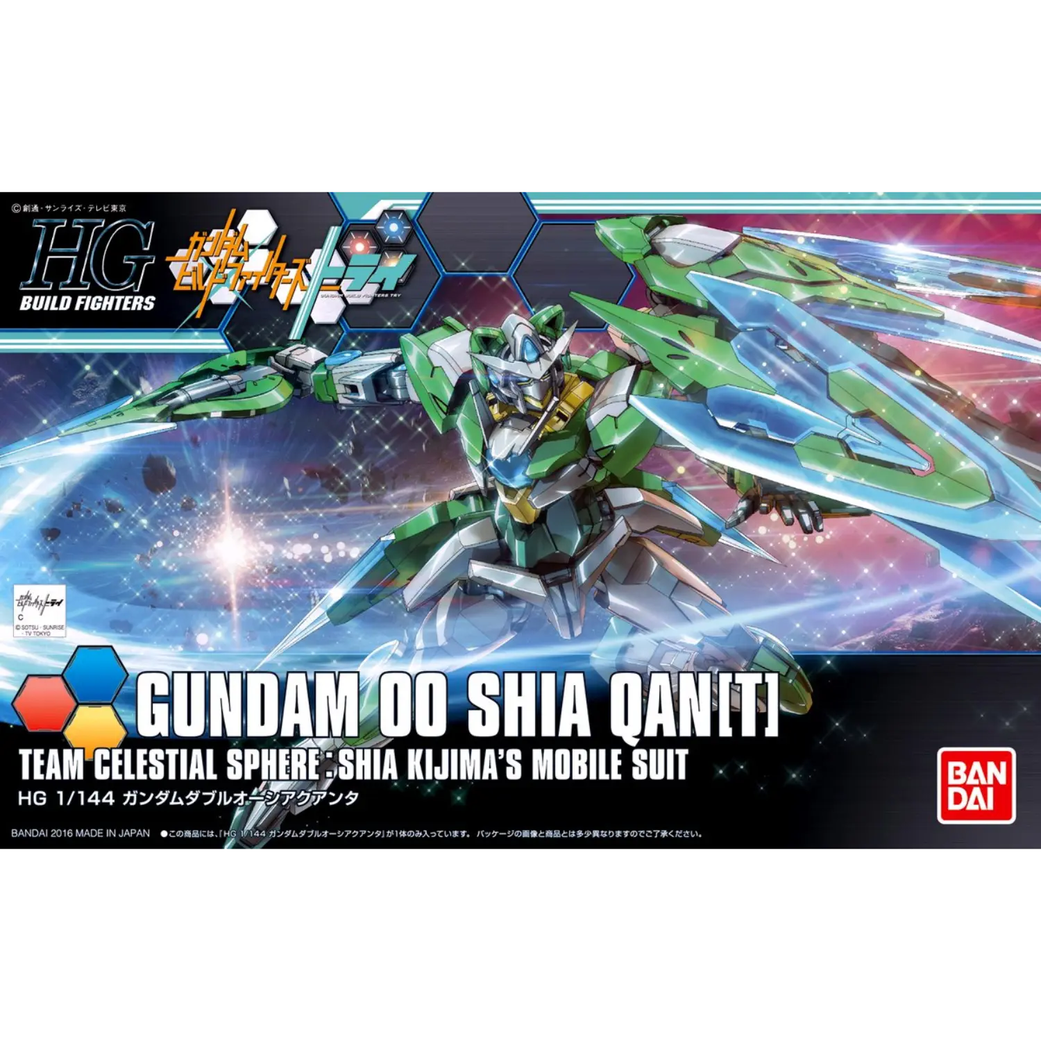 The 1/144 Gundam 00 Shia Qan[T] from Gundam Build Fighters Try Island Wars features Shia Kijima's unique customization of the 00 Qan[T]. This High Grade (HGBF) model kit includes a sword, shield, and sword bits that can combine and change shape, utilizing clear parts for added visual effect.