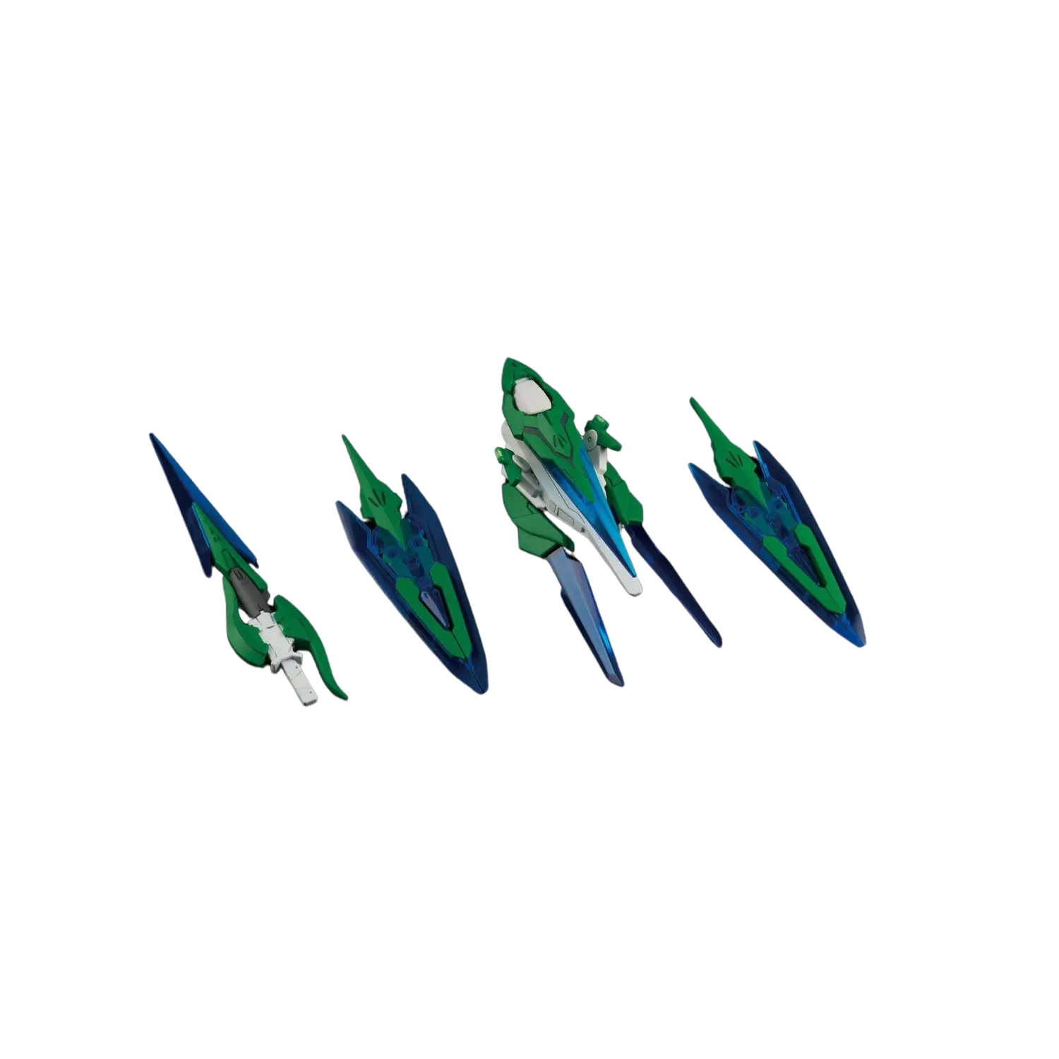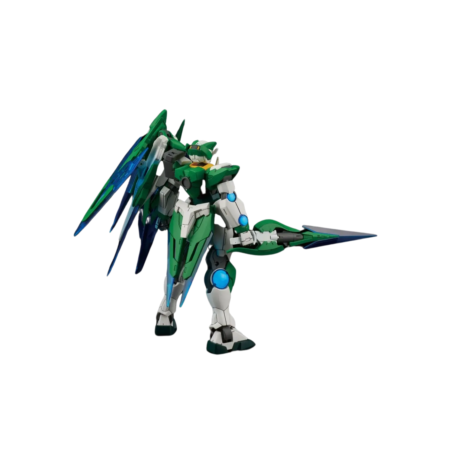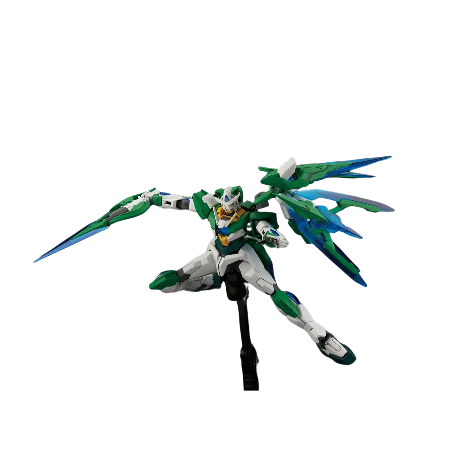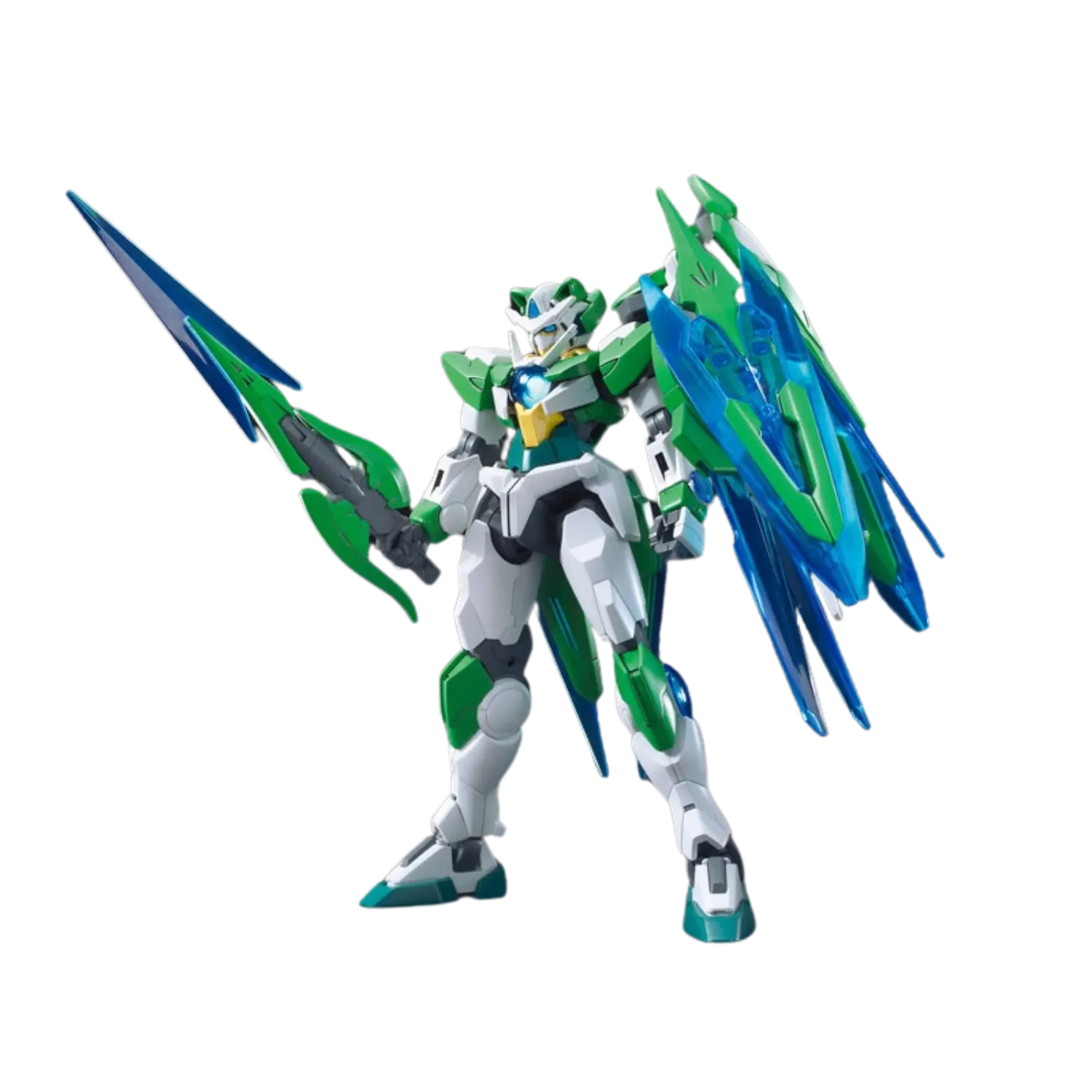 The 1/144 Gundam 00 Shia Qan[T] from Gundam Build Fighters Try Island Wars features Shia Kijima's unique customization of the 00 Qan[T]. This High Grade (HGBF) model kit includes a sword, shield, and sword bits that can combine and change shape, utilizing clear parts for added visual effect.