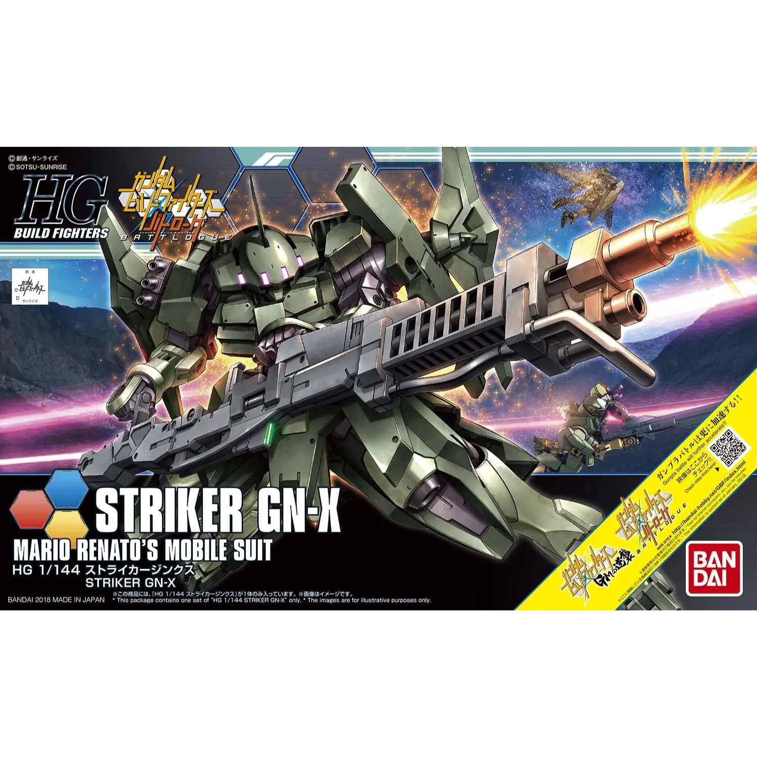 The 1/144 Striker GN-X from Gundam Build Fighters: Battlogue is a versatile High Grade (HGBF) model kit, featuring Full Armor that can be purged to reveal a light armor mode. This kit includes a GN Smart Gun, GN Discharger, dual GN Defense Rods, and beam sabers for dynamic display options.