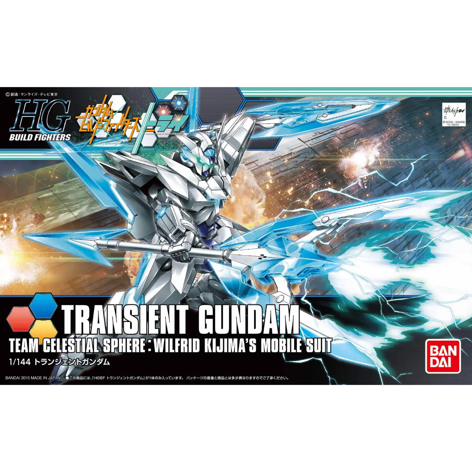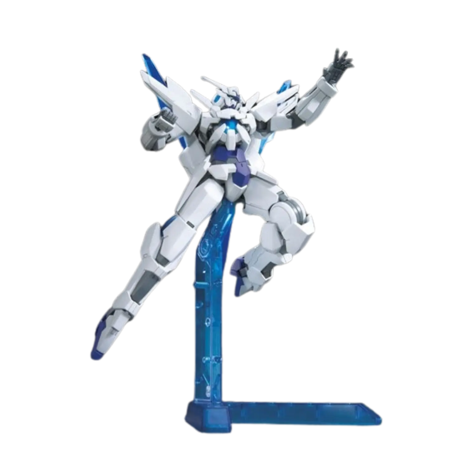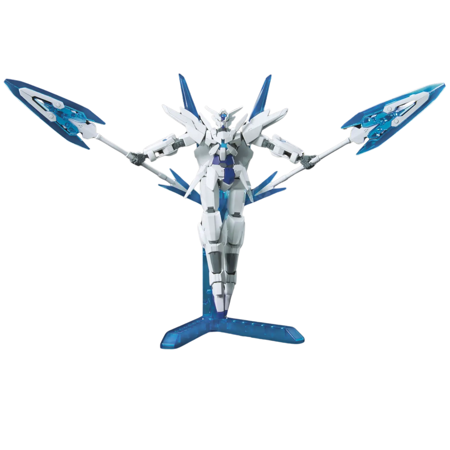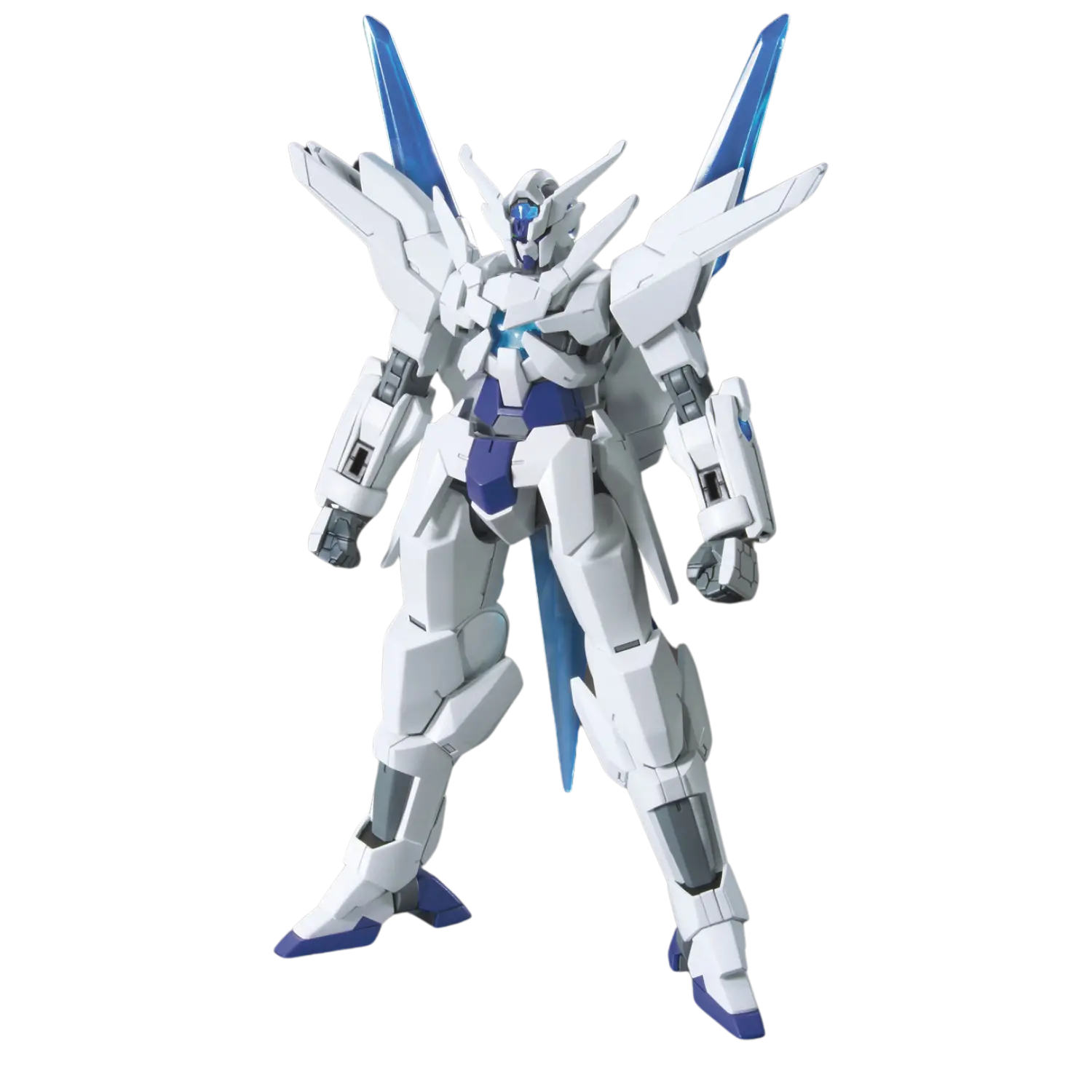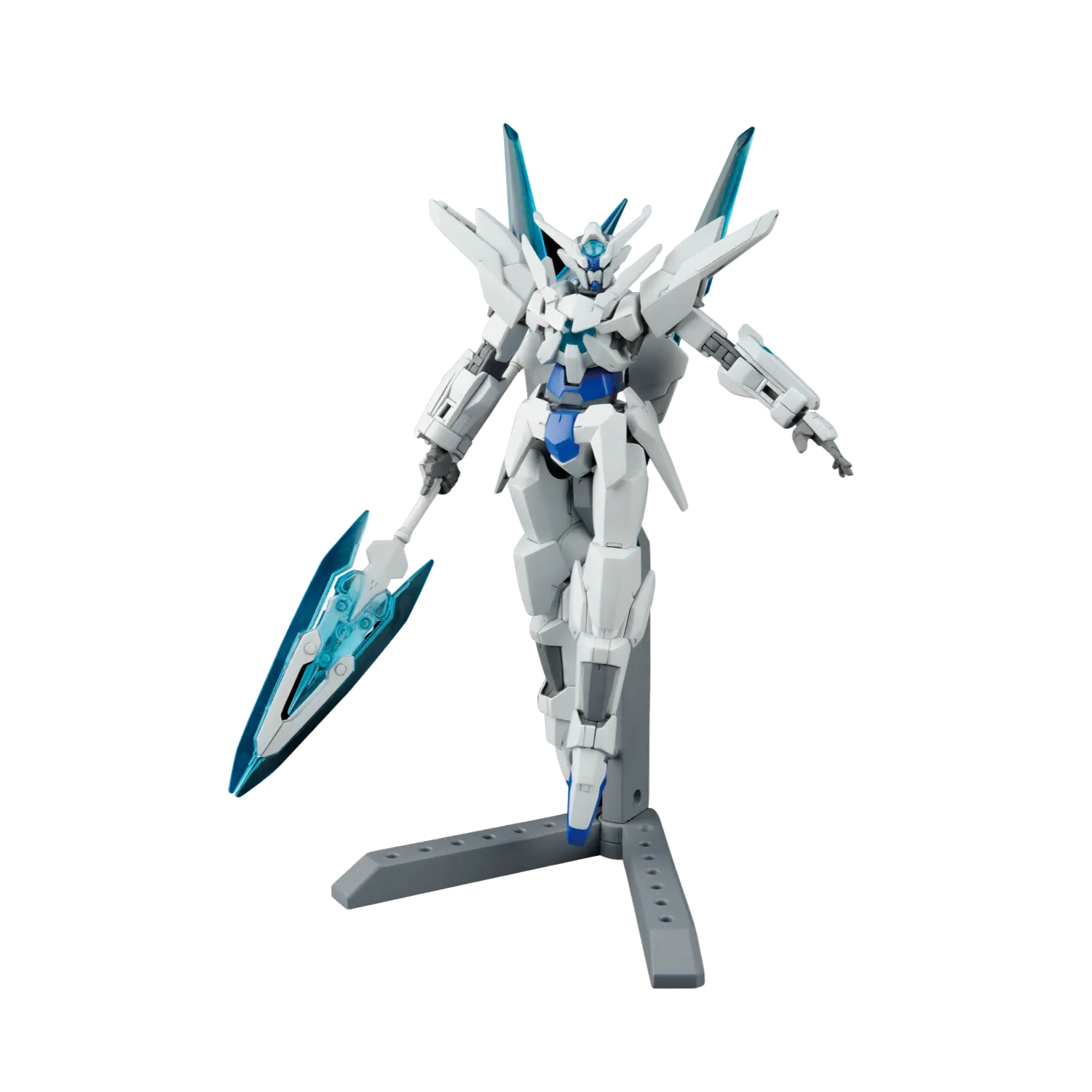 The 1/144 Transient Gundam from Gundam Build Fighters Try is Wilfried Kijima’s striking mobile suit, featuring a unique white and blue color scheme with clear blue accents. This High Grade (HGBF) model kit includes the GN Partisan spear and a display base for enhanced posing.