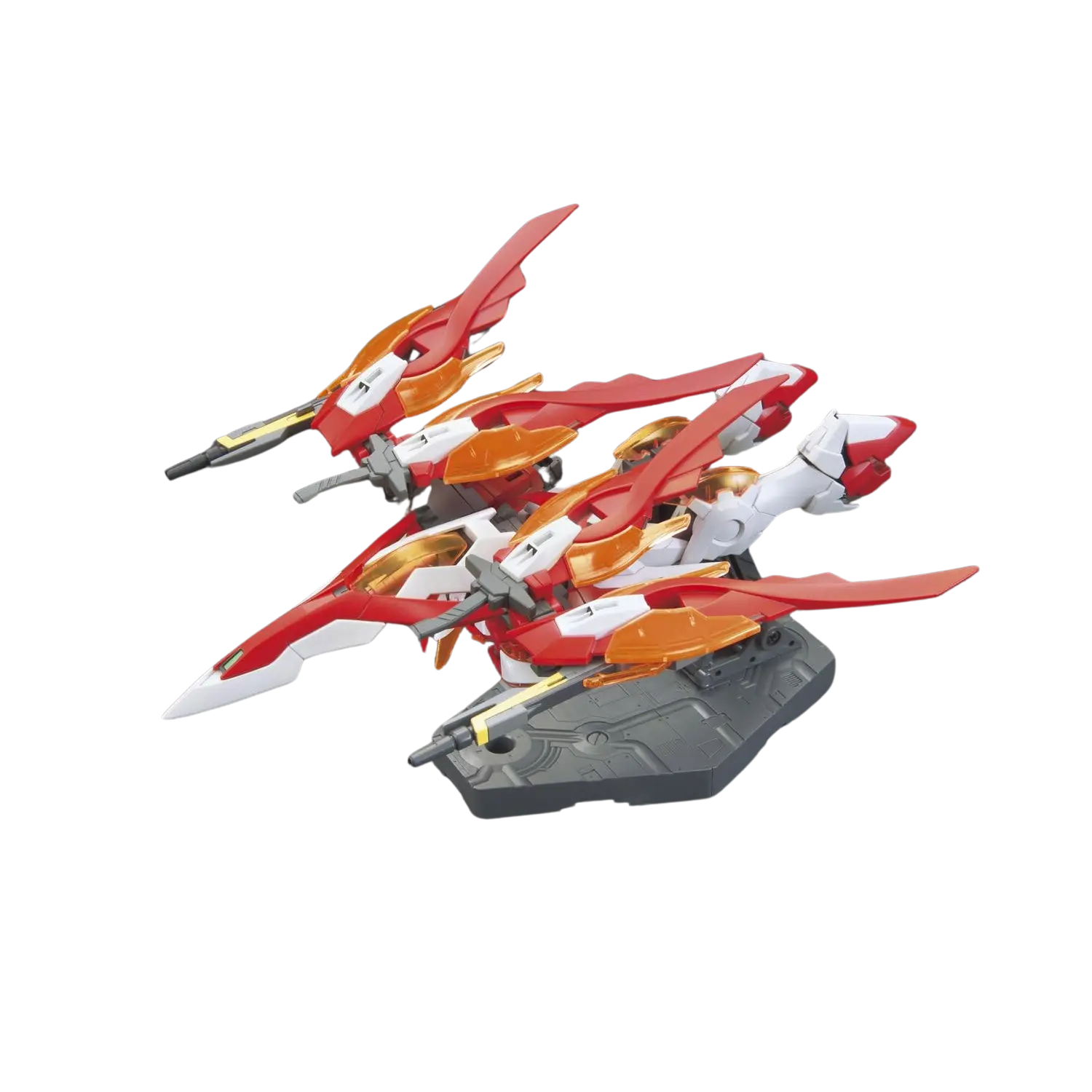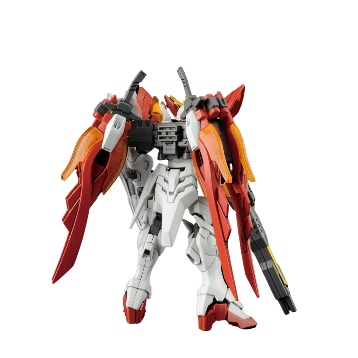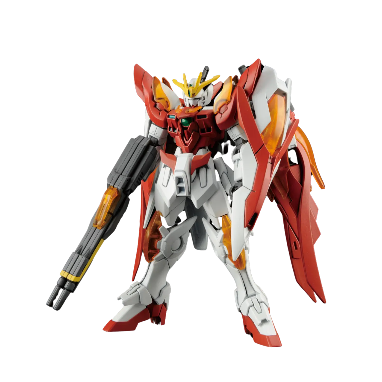 The 1/144 Wing Gundam Zero Honoo from Gundam Build Fighters Honoo joins the High Grade (HGBF) line as Kouen Yusei's customized Wing Gundam Zero. This model kit includes the Hyper Caletvwich, twin buster rifle, and a shield with beam saber storage. It can transform into Neobird Flame Mode for dynamic displays.