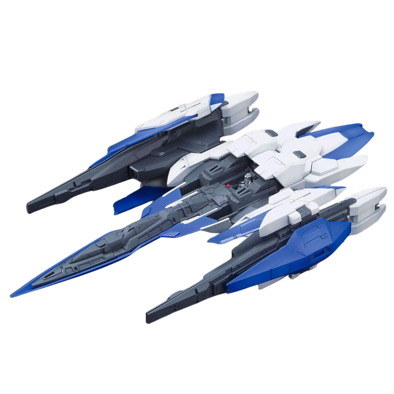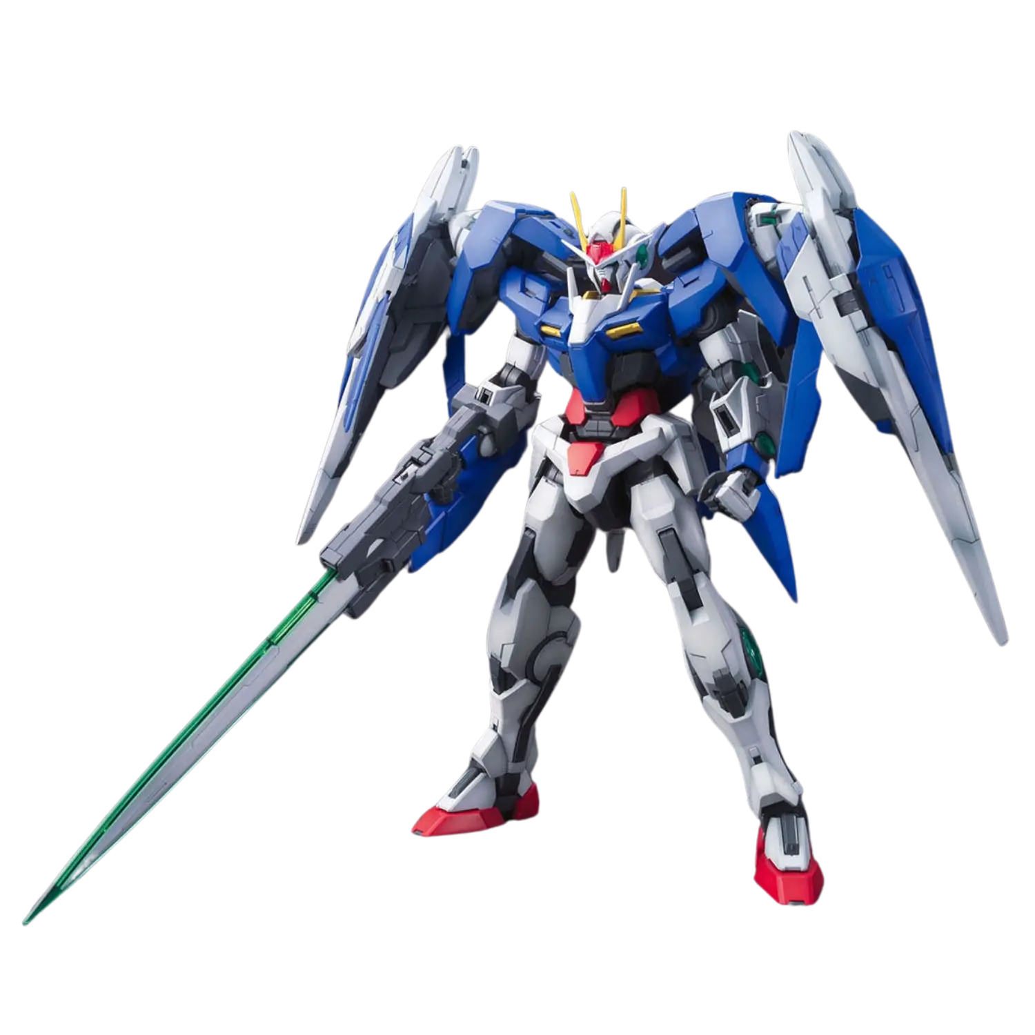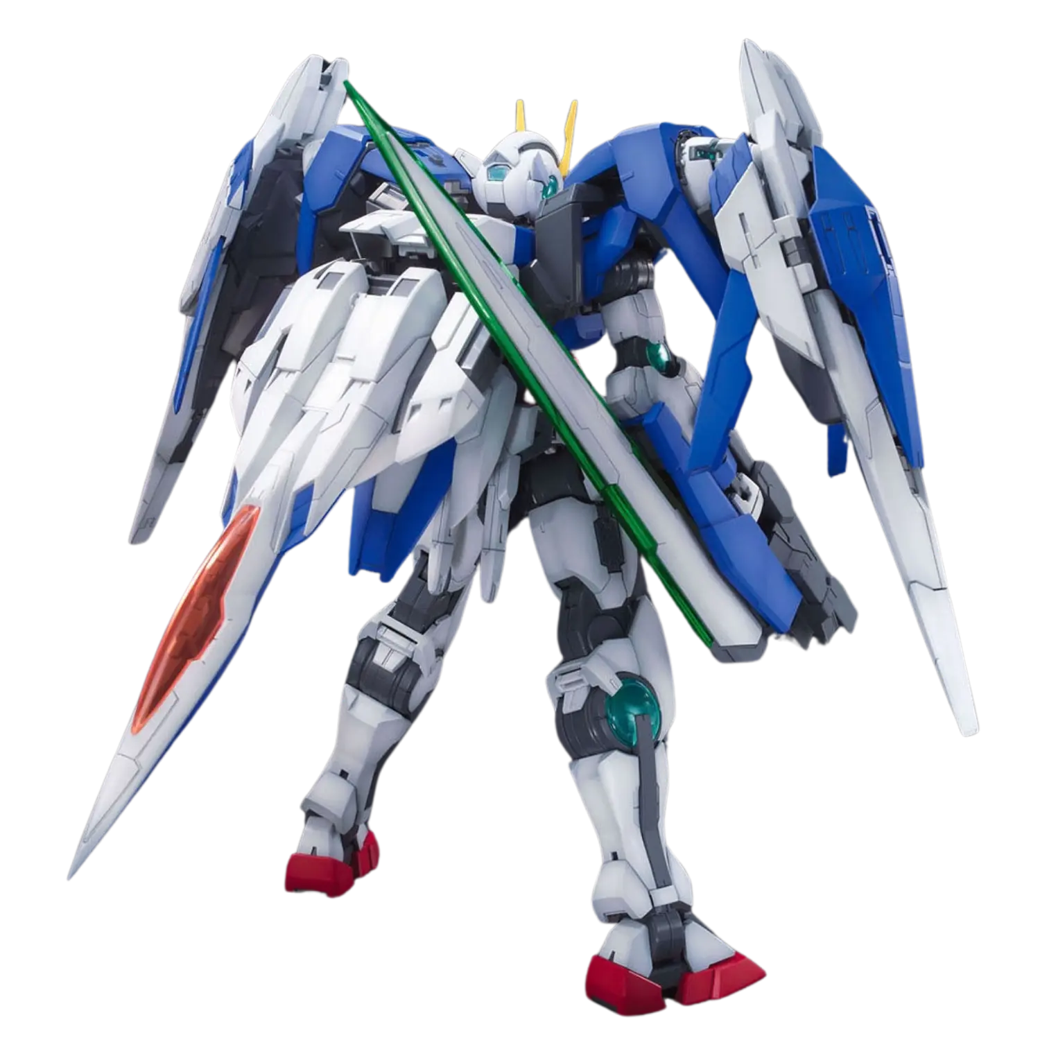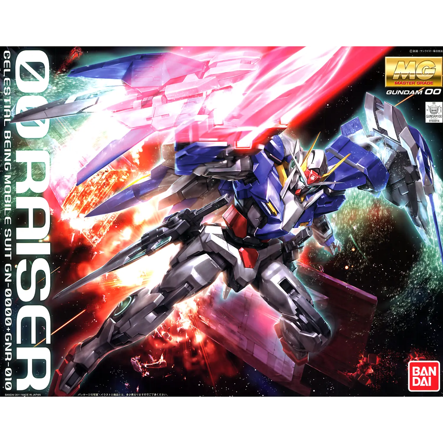 The 1/100 00 Raiser from Mobile Suit Gundam 00 enters the Master Grade (MG) series, complete with GN Drives that can house LED lights for an immersive display. This model kit includes the full weapon loadout, featuring GN Sword II, GN Sword III, and energy tanks for movie accuracy.