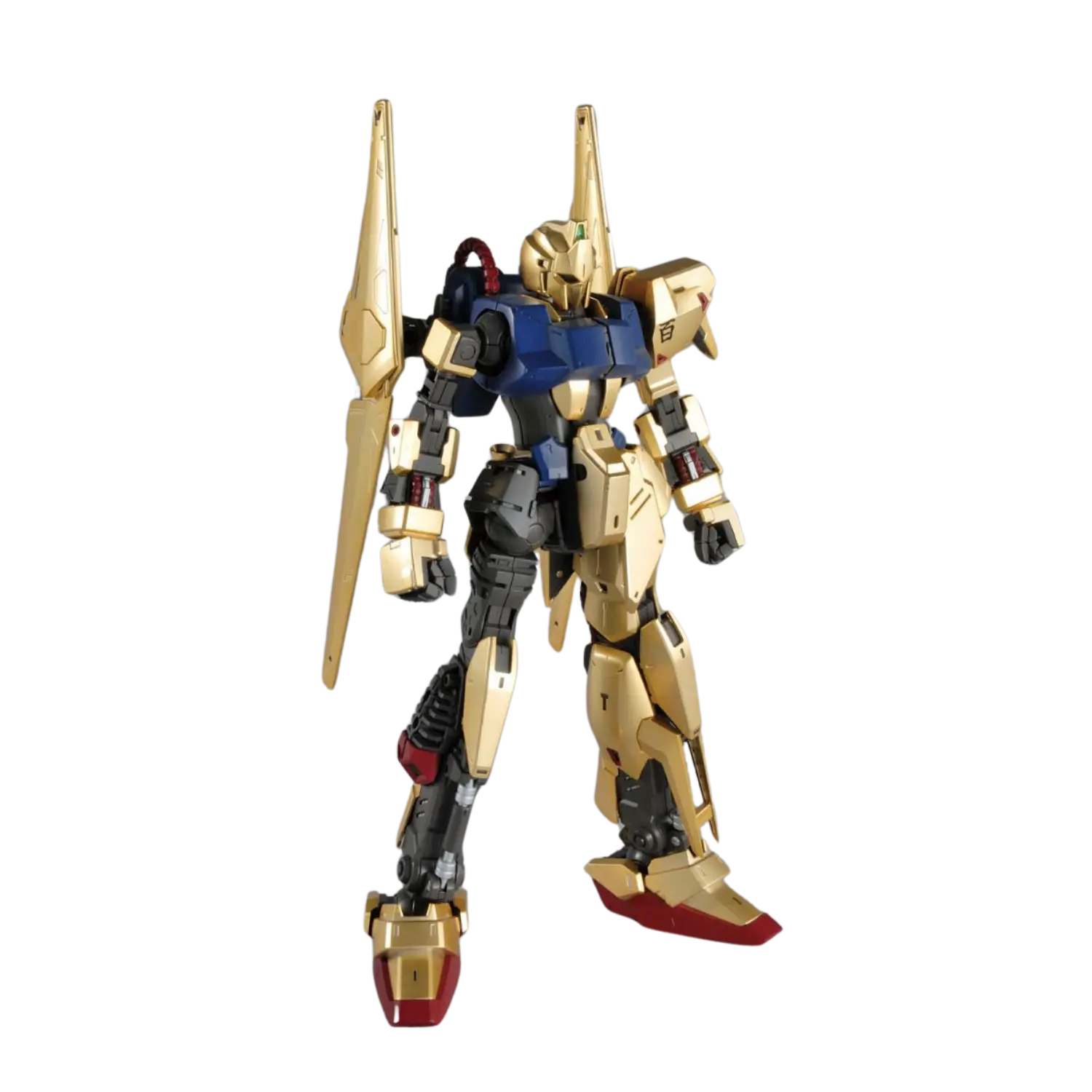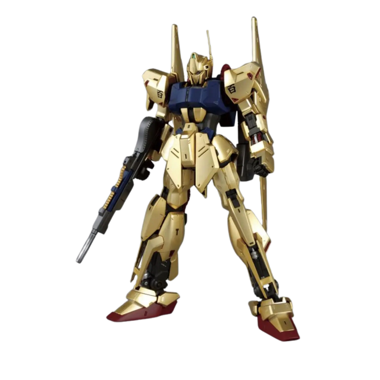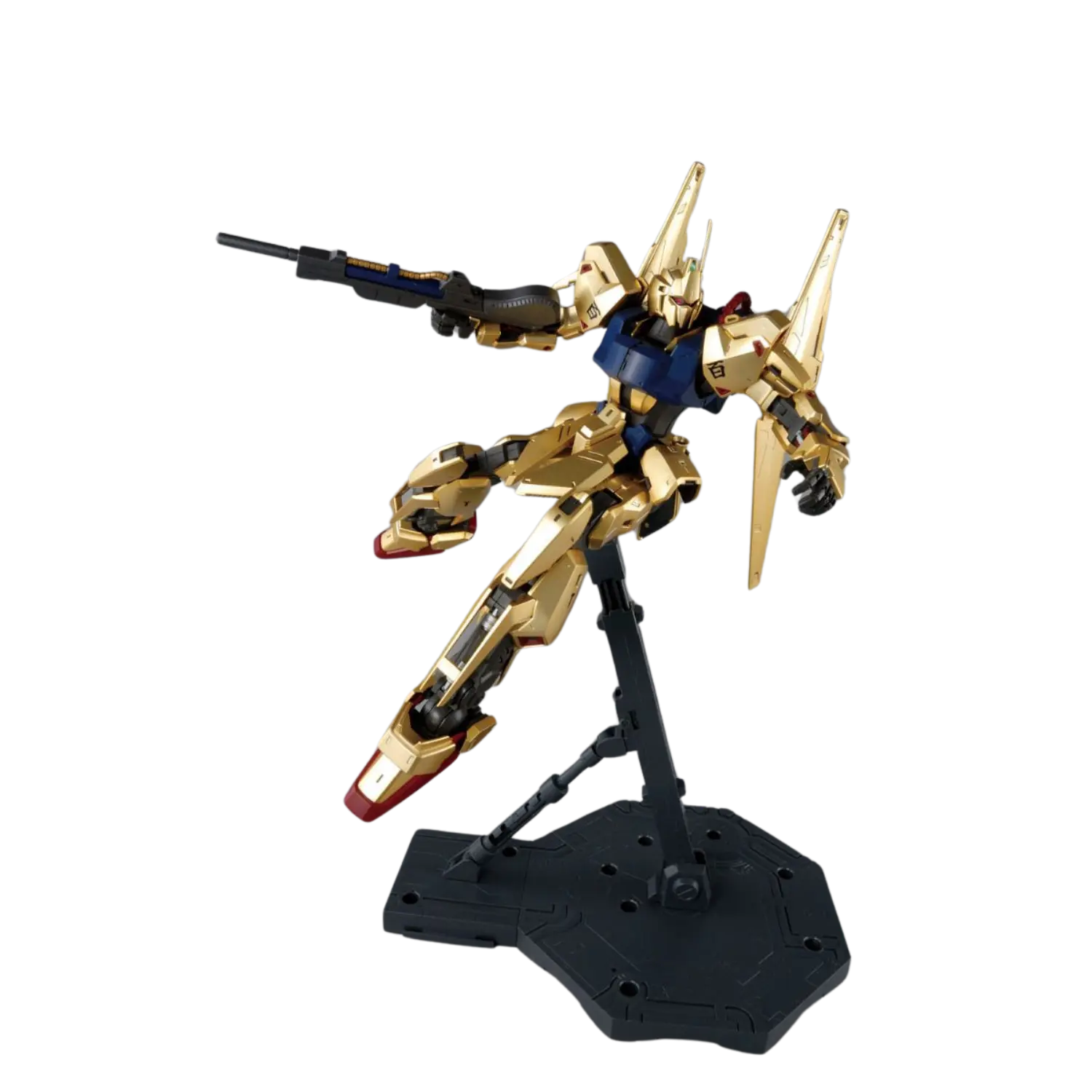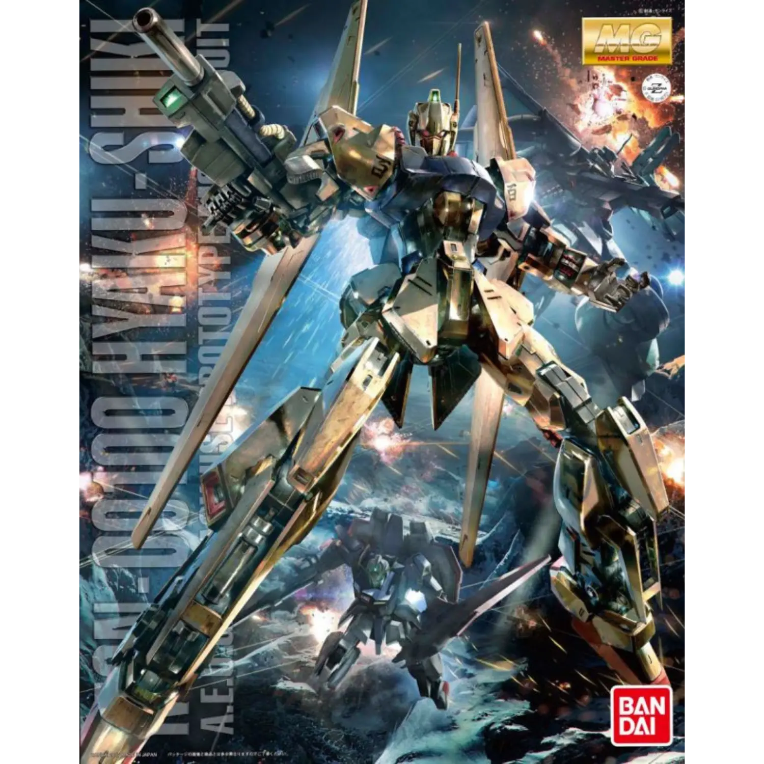 The MG 1/100 Hyakushiki Ver. 2.0 brings new life to this iconic mobile suit from Mobile Suit Zeta Gundam. Featuring a stunning mekki-plated finish with under-gated parts, the Hyakushiki achieves a flawless golden shine. The updated inner frame ensures enhanced poseability without compromising stability, while flexible joints on the back binders allow dynamic movements. Multiple sensor parts are included for customizable eye expressions. Complete with a full arsenal, this kit celebrates the Gundam Team trio in all its glory.