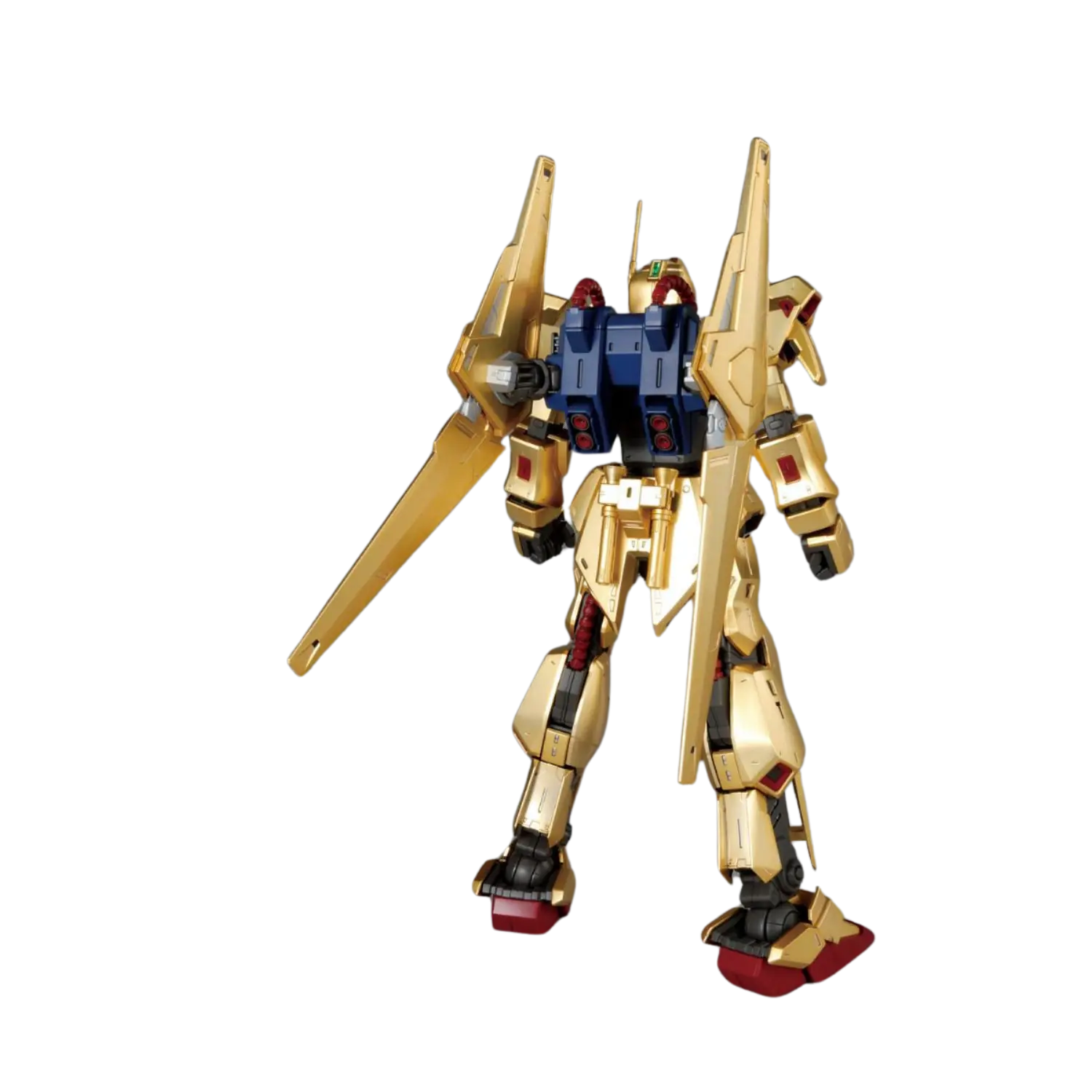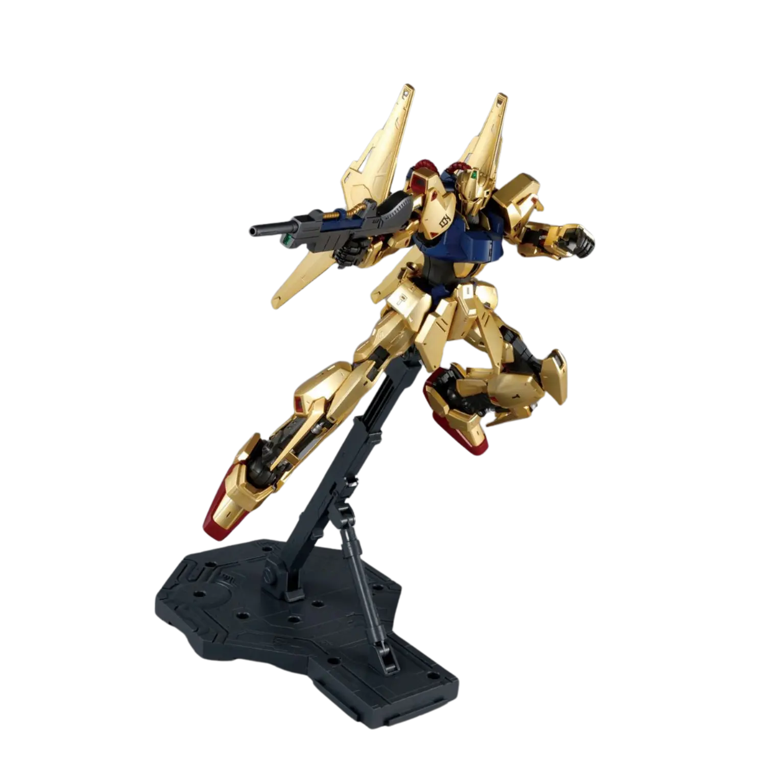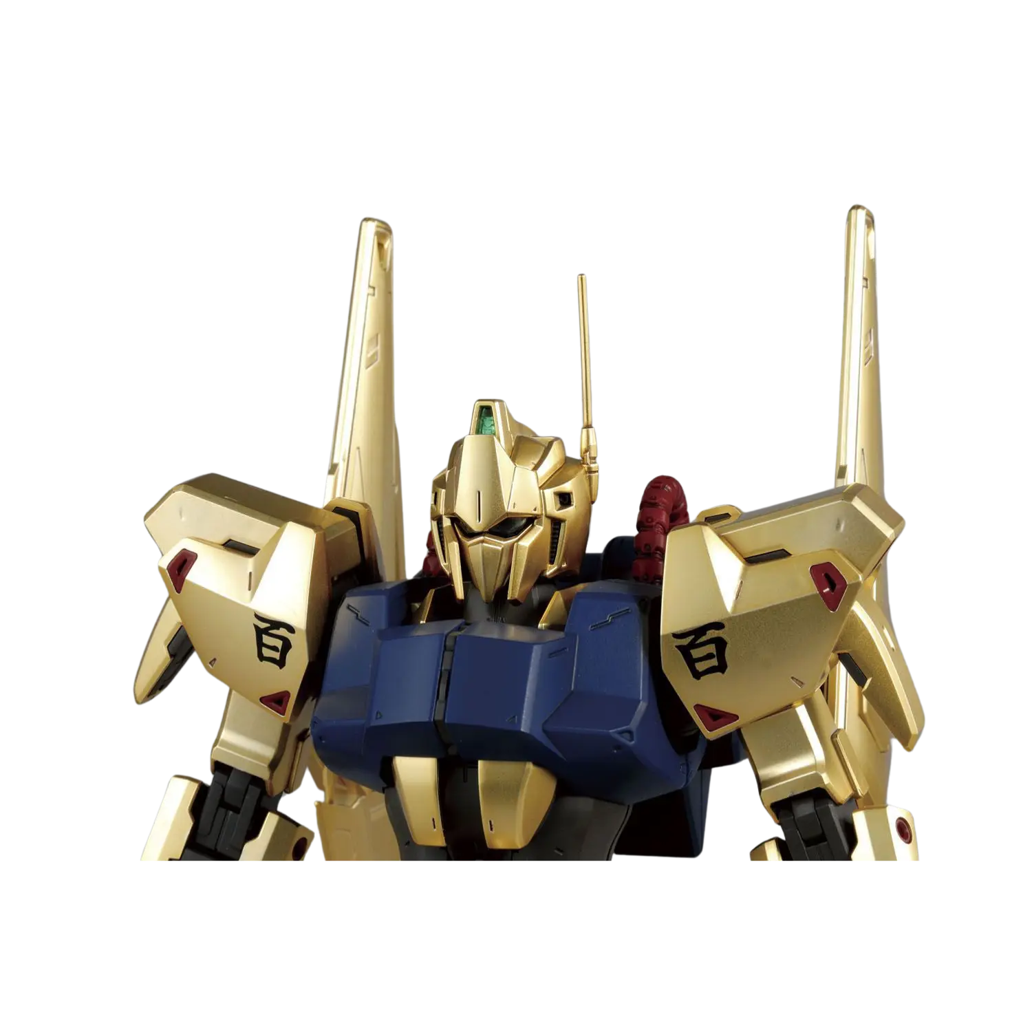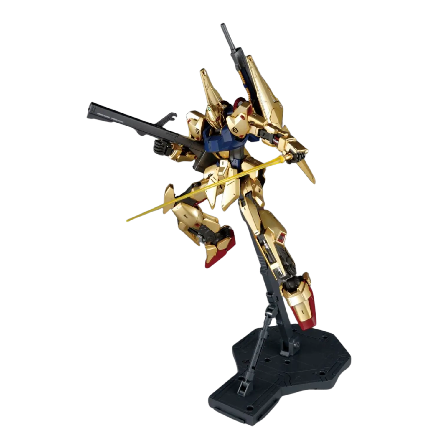 The MG 1/100 Hyakushiki Ver. 2.0 brings new life to this iconic mobile suit from Mobile Suit Zeta Gundam. Featuring a stunning mekki-plated finish with under-gated parts, the Hyakushiki achieves a flawless golden shine. The updated inner frame ensures enhanced poseability without compromising stability, while flexible joints on the back binders allow dynamic movements. Multiple sensor parts are included for customizable eye expressions. Complete with a full arsenal, this kit celebrates the Gundam Team trio in all its glory.