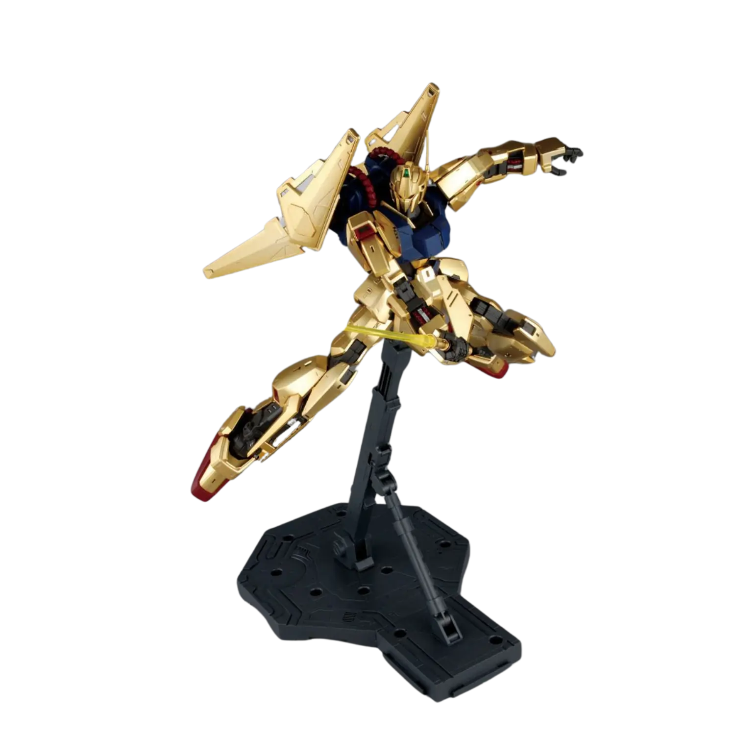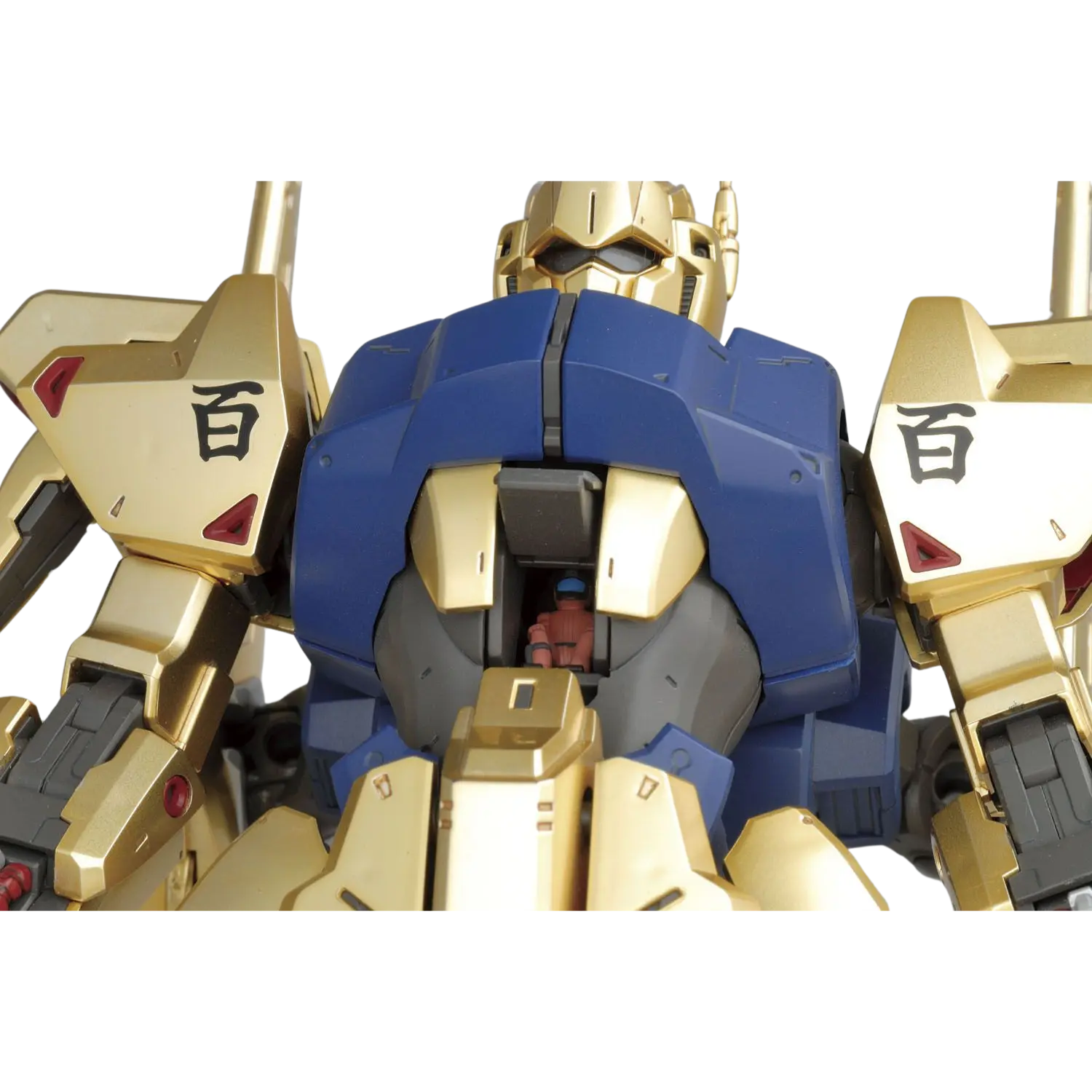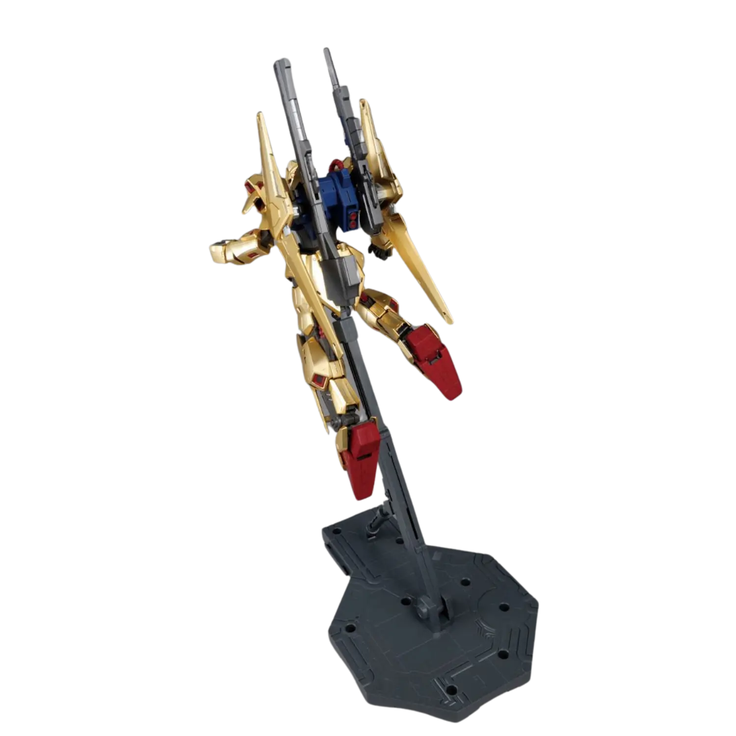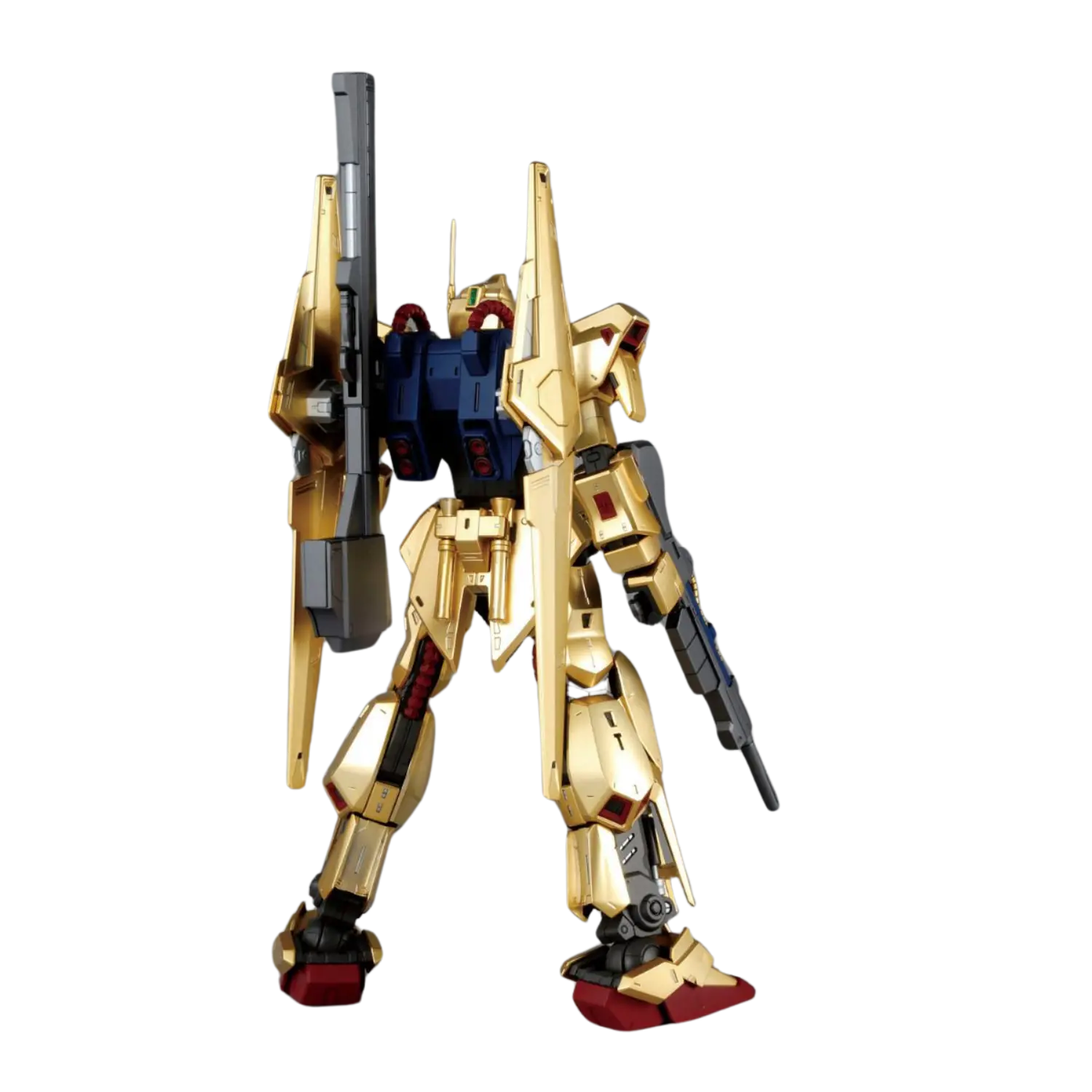 The MG 1/100 Hyakushiki Ver. 2.0 brings new life to this iconic mobile suit from Mobile Suit Zeta Gundam. Featuring a stunning mekki-plated finish with under-gated parts, the Hyakushiki achieves a flawless golden shine. The updated inner frame ensures enhanced poseability without compromising stability, while flexible joints on the back binders allow dynamic movements. Multiple sensor parts are included for customizable eye expressions. Complete with a full arsenal, this kit celebrates the Gundam Team trio in all its glory.