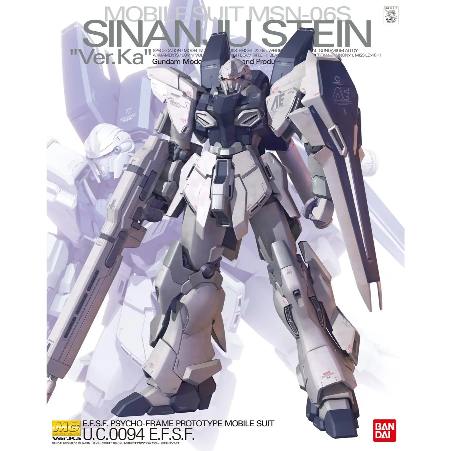 The MG 1/100 MSN-06S Sinanju Stein Ver. Ka from "Mobile Suit Gundam UC" is a highly detailed Master Grade model kit featuring a sophisticated design and enhanced articulation. Based on the original MG Sinanju Ver. Ka frame, this variant includes over 15 new runners, showcasing updated parts such as the innovative Emotion Manipulator hands for detailed finger articulation and new weapon locking tabs for secure weapon attachment. The model kit comes molded in multiple colors and includes waterslide decals and foil stickers for detailed markings.